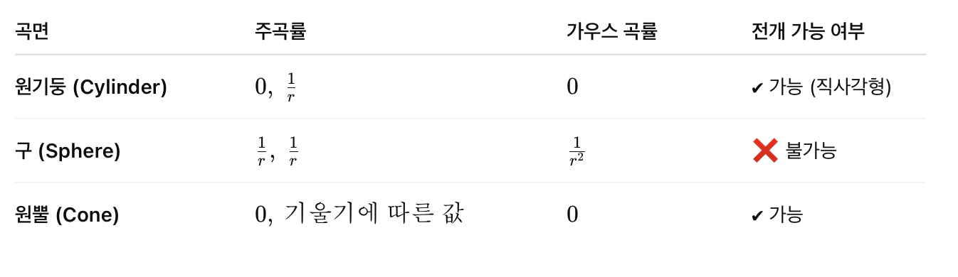 구는 펼칠 수 없지만 원기둥은 종이처럼 펼쳐진다 그 이유는 곡률이 0이기 때문이다.