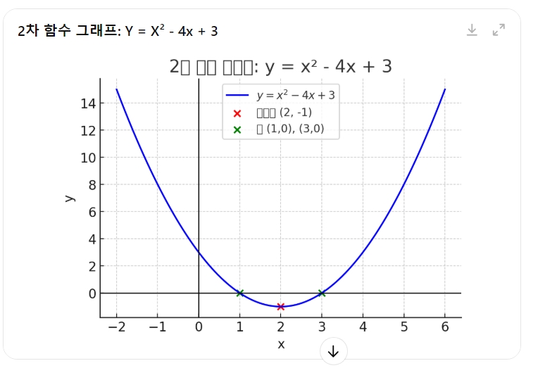 y = x² - 4x + 3의 그래프를 생성하고, 꼭짓점과 근을 분석할 수 있다.